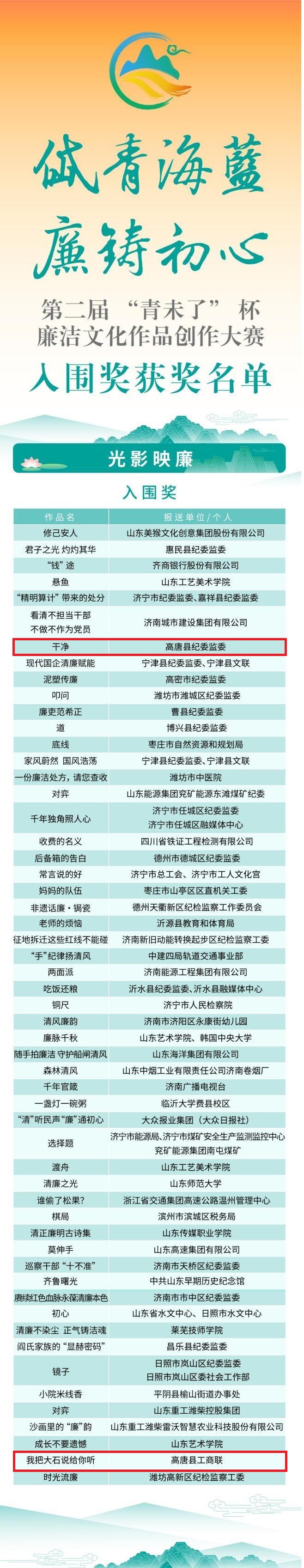 第二届“青未了”杯廉洁文化作品创作大赛以“岱青海蓝 廉铸初心”为主题,由中国纪检监察杂志社、山东省纪委监委、山东省文学艺术界联合会、济南市纪委监委主办,济南高新区党工委、济南高新区纪检监察工委、山东广播电视台承办,共收到全国30个省(区、市)报送的各类作品39384部。高唐县纪委监委报送的微视频《干净》和高唐县工商联报送的微视频《我把大石说给你听》荣获入围奖。