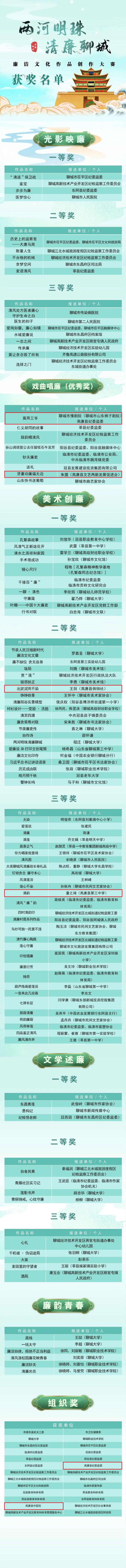 “两河明珠·清廉聊城”廉洁文化作品创作大赛由聊城市纪委监委机关、聊城市委宣传部、聊城市文学艺术界联合会、聊城市文化和旅游局、聊城市新闻传媒中心联合主办。高唐县纪委监委报送的山东梆子作品《莫用三爷》和高唐县文艺两新发展促进会朱盟报送的对口山东快书作品《贤妻劝廉福无边》获得戏曲唱廉优秀奖,高唐县供销社王剑报送的书画作品《出淤泥而不染》和高唐第三中学董之琦报送的书画作品《清韵》分别荣获美术创廉类二、三等奖。